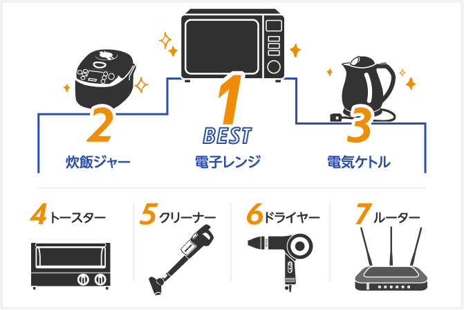 第1位は電子レンジ。温めるだけの単機能レンジから本格調理が可能なオーブンレンジまで種類も豊富!