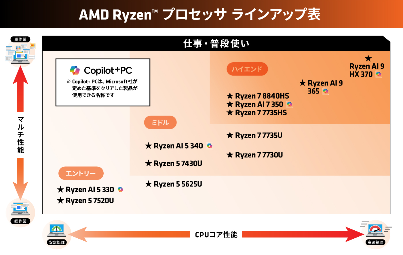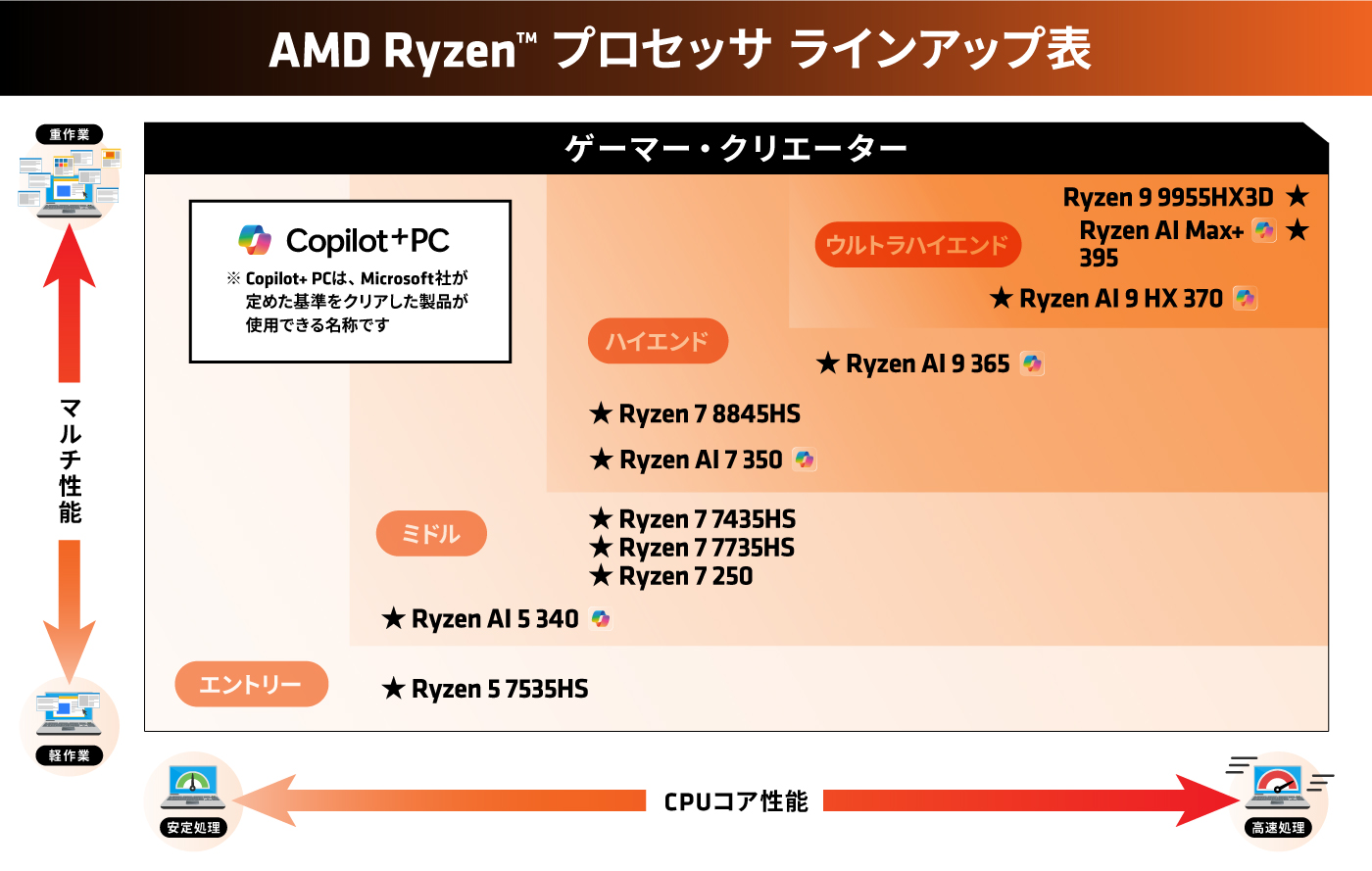 ※2. 2025年3月時点のAMD製品および競合製品の仕様に基づきます。AMD Ryzen™ AI 300 シリーズ プロセッサのNPUは最大55TOPSを提供します。(一部カスタム製品を除く。)